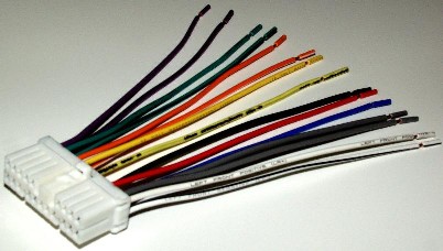 This is the 20-position plug that connects to the SVX factory AM/FM/Cassette unit. There are 15 wires, with the same EIA-standard color-coding as other after-market harnesses. The wires also have text labels (for example, "Left Front Speaker +") and pre-stripped ends ready for you to crimp or solder. The 15 wires are: