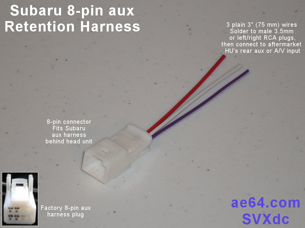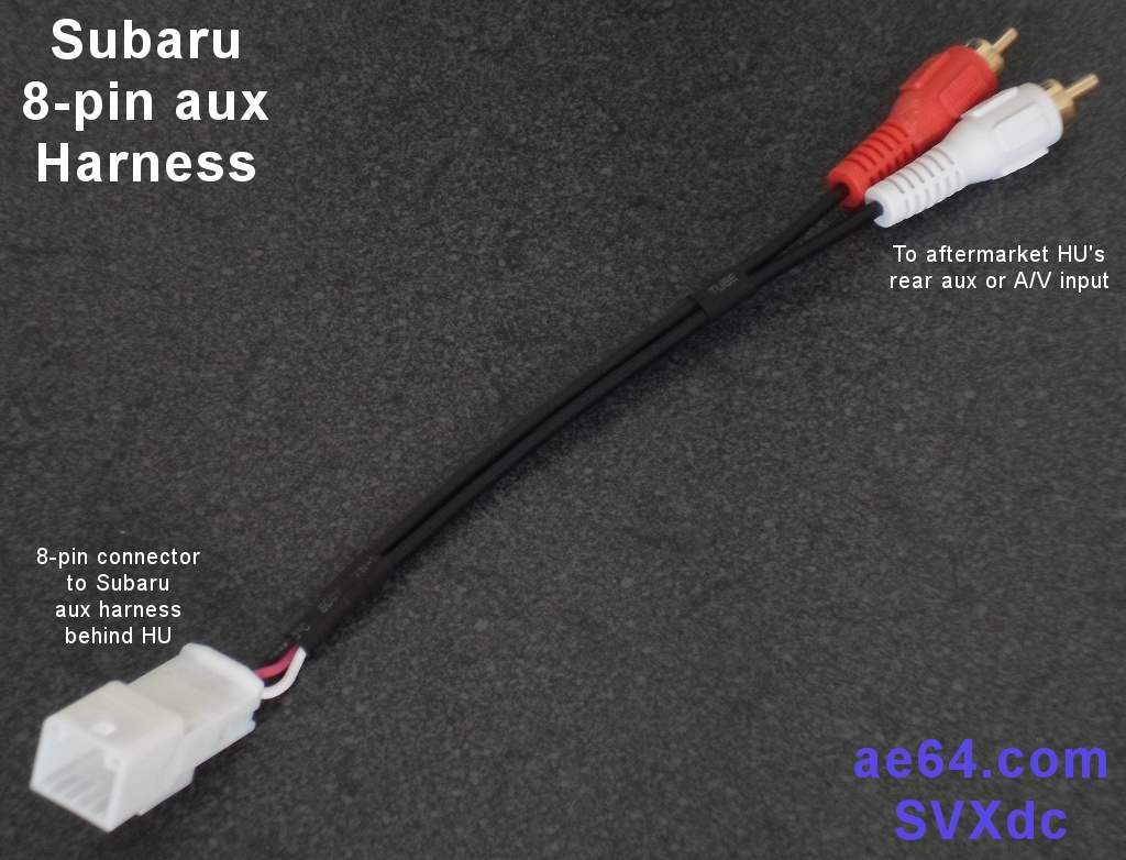 Product DescriptionIn Subaru models listed at the top of this page, the factory HU has an 8-pin socket on the rear for its aux input. A factory harness connects from the back of the HU to the back of the 3.5mm aux jack (in the armrest center console in most models, or an "ashtray" pod in 2007 Impreza/WRX/STi and 2007–2008 Forester). That harness has proprietary plugs at both ends. The harness handles the stereo aux jack only, not the USB socket (if your car also has one). The white 8-pin connector on my aux retention adapter fits the end of the car's aux harness that is (or was) plugged into the back of your factory-installed HU. I'm currently offering this harness in either of two options for the aux connection: